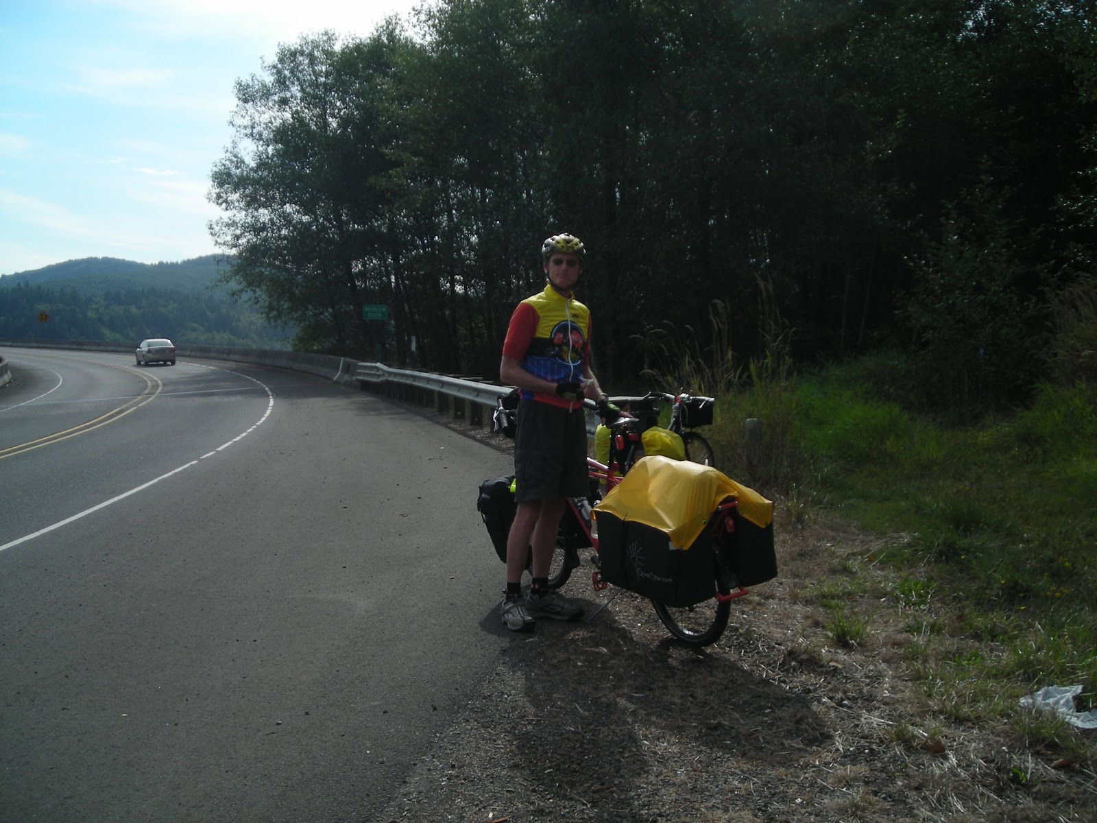 The scenery was beautiful, and we stopped a couple times to drink water, admire the amazing RAIN forest, and then get back on the bikes. Bob and I kept calling in the Triplets. Their feet spinning pushed mine along (I’m sure of it, their presence was so real!), and I actually pedalled all the way up BOTH mountains!